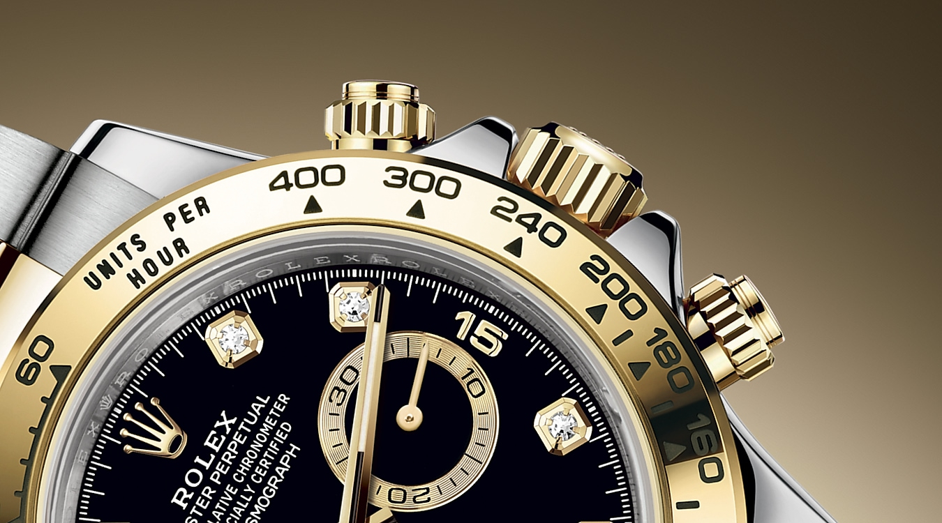 タキメーター目盛り および3つのカウンターとプッシャーを備えたコスモグラフ デイトナは 耐久レースドライバーの究極の計時ツールとなるようにデザインされた。べゼルは 経過時間に基づき所定の距離間の平均速度を示すタキメーター目盛りを備えている。この目盛りの最適な視認性により コスモグラフ デイトナは キロまたはマイルで表示される 時速400ユニットまでのスピードが計測可能な理想的なツールとなっている。