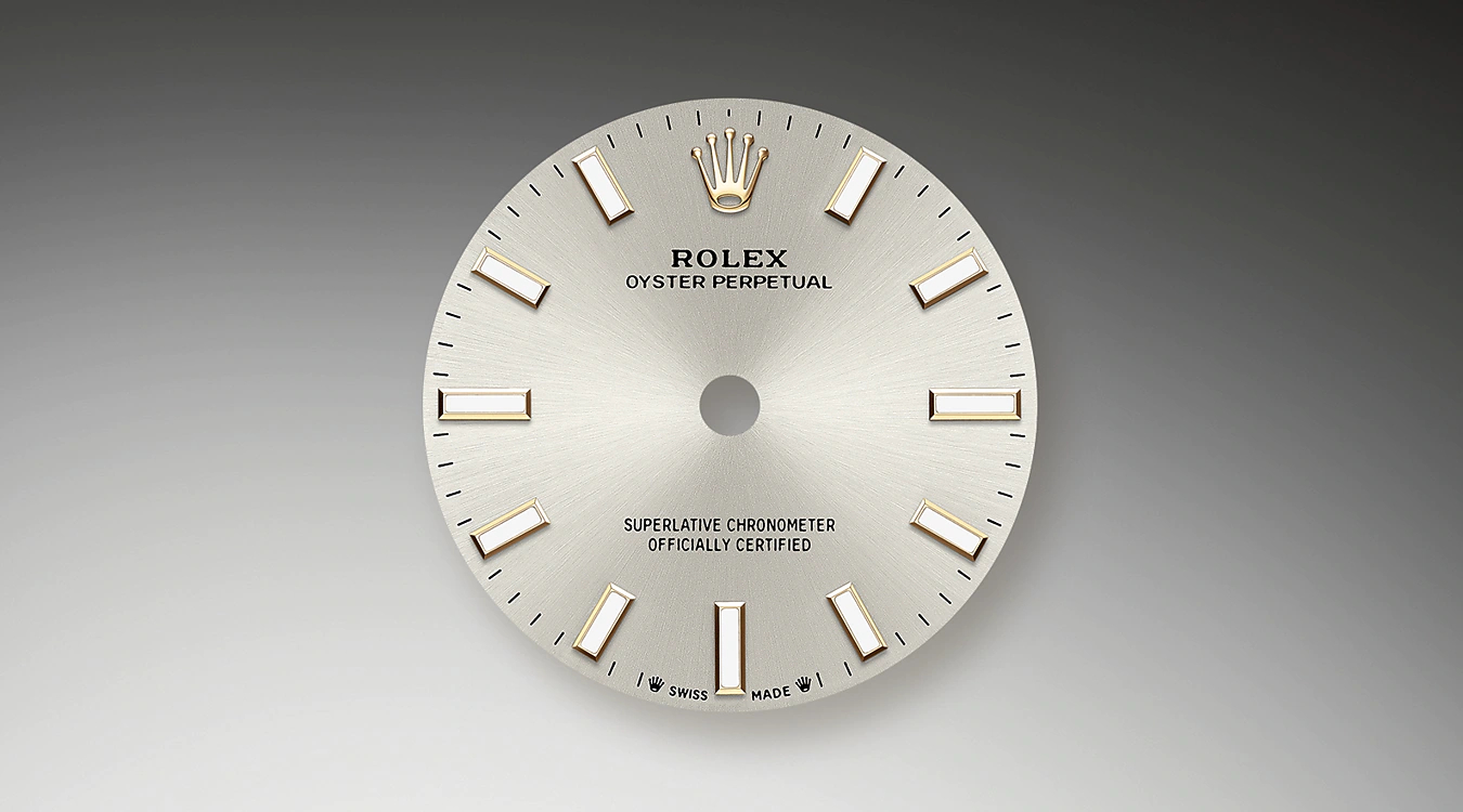 サンレイ仕上げは オイスター パーペチュアルコレクションの多くのダイアルに繊細な光の反射をもたらす。これはダイアルの中心から外側に向かって溝を作る 熟練のブラッシング技術によるものだ。光はそれぞれの彫りに沿って均一に拡散され 手首の位置に応じてわずかに動く 特徴的な輝きを生み出す。サンレイ仕上げが完了すると 物理蒸着または電気メッキによりダイアルにカラーが塗布される。軽くニスでコーティングし ダイアルの最終的な外観が完成する。