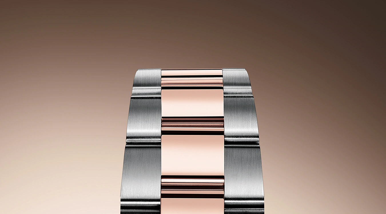オイスター ブレスレットは 形と機能 美しさと技術の完璧な融合であり 堅牢な構造と快適な着用感を特徴とする。ブレスレットにはオイスタークラスプとイージーリンクエクステンションリンクも備わっており どちらもロレックス独自の発明である。この独創的なシステムにより ブレスレットの長さを約5 mm延長させることができ あらゆる場面でより快適な装着感が実現する。
