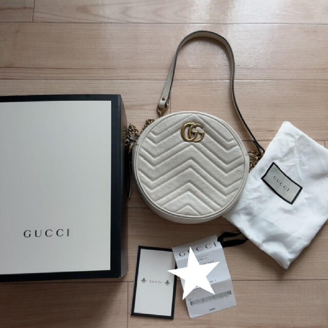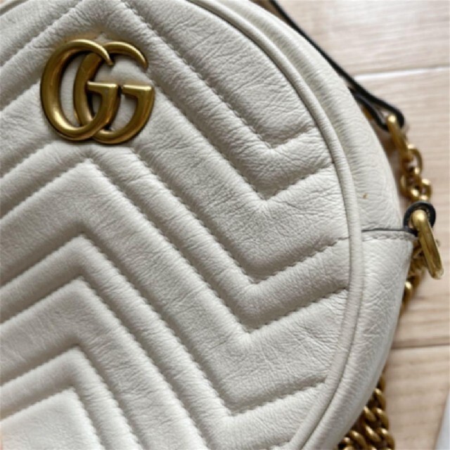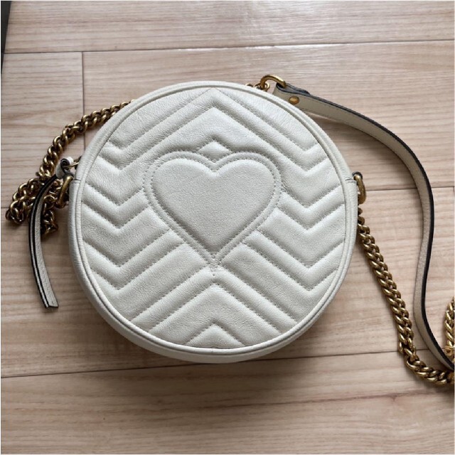 〔GGマーモント〕ラインの新作ミニバッグ。ラウンドフォルムにチェーン ショルダーストラップが付いています。ヴィンテージ感漂うこのバッグのフロントにはグッチを象徴するダブルG ハードウェア、バックにはシェブロン キルティング レザーのハート ディテールがあしらわれています。