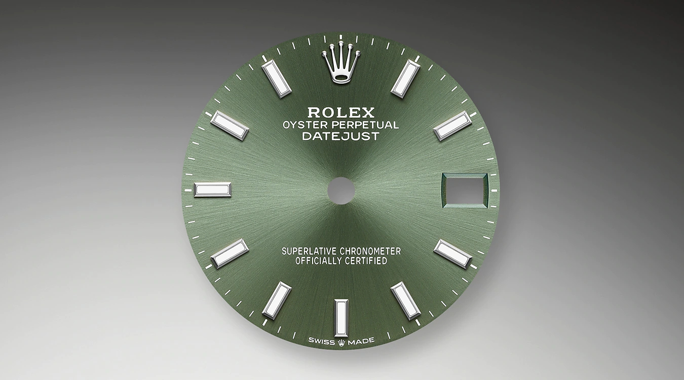 サンレイ仕上げは オイスター パーペチュアルコレクションの多くのダイアルに繊細な光の反射をもたらす。これはダイアルの中心から外側に向かって溝を作る 熟練のブラッシング技術によるものだ。光はそれぞれの彫りに沿って均一に拡散され 手首の位置に応じてわずかに動く 特徴的な輝きを生み出す。サンレイ仕上げが完了すると 物理蒸着または電気メッキによりダイアルにカラーが塗布される。軽くニスでコーティングし ダイアルの最終的な外観が完成する。