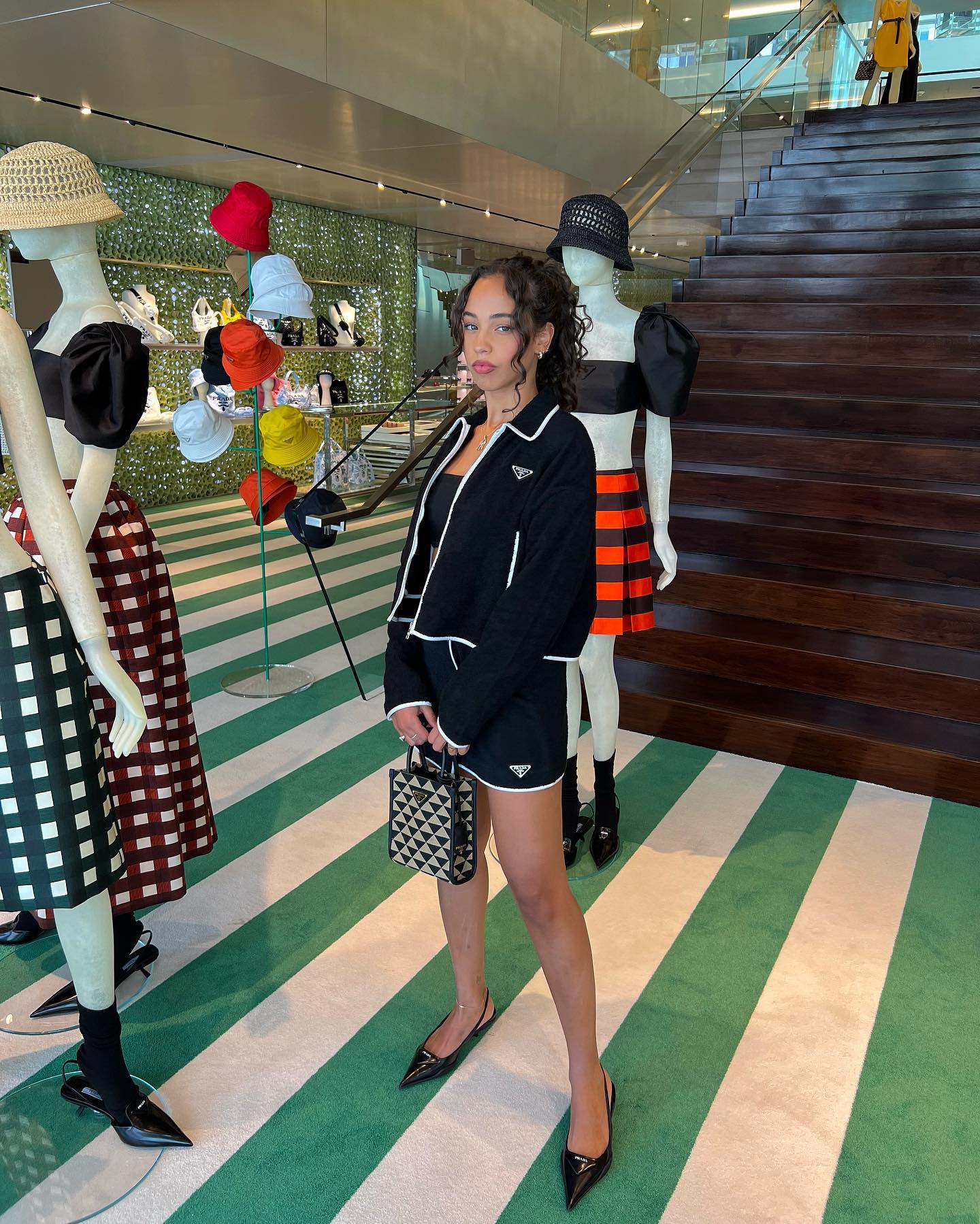 スペインで圧倒的な人気を集めるシンガーのマリアは、白のパイピングジャケットとスカートのセットアップスタイルに、マイクロバッグを合わせた着こなし。足元はスリングバックパンプスで上品にまとめています。