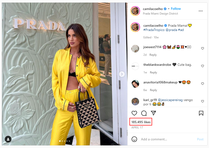 インフルエンサーのカミラは、ビビットなイエローのシャツとパンツのセットアップに、マイクロバッグをコーディネート。