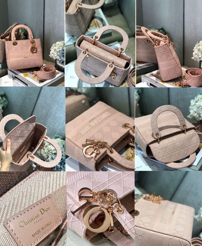 Lady D-Lite手袋 .体现了迪奥对优雅和美丽的愿景。一款光泽柔美的包包 .让您感觉摩登而又永恒。米色Cannage全刺绣帆布和正面Dior标志的精美饰面赋予它强大的存在感。标志性的DIOR吊饰闪烁着淡金色的光芒 .与轮廓相得益彰。中等尺寸 .带可拆卸肩带 .全刺绣。
