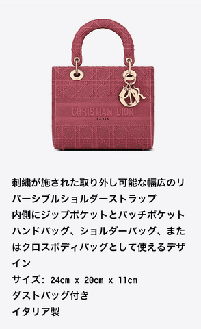 「LadyDeeLight」ハンドバッグは エレガンスと美しさというブランドのビジョンを体現しています。 象徴的な「canage」パターンは ダークデニムブルーで刺繍されています。 フロントに同色の「ディオール」ロゴをあしらい エレガントでフェミニンな魅力を醸し出しています。 アイコニックなライトゴールドの「ディオール」ペンダントが バッグの魅力をさらに高めています。 ミディアムボディシェイプ 取り外し可能なフル刺繍のワイドショルダーストラップ。 様々なアレンジが楽しめます。取り外し可能な刺繍入り両面ワイドショルダーストラップ内部ジップポケットとパッチポケットハンドバッグ ショルダーバッグ メッセンジャーバッグとして使用できますサイズ:24cm x 20cm x 11cmダストバッグ付きイタリア製