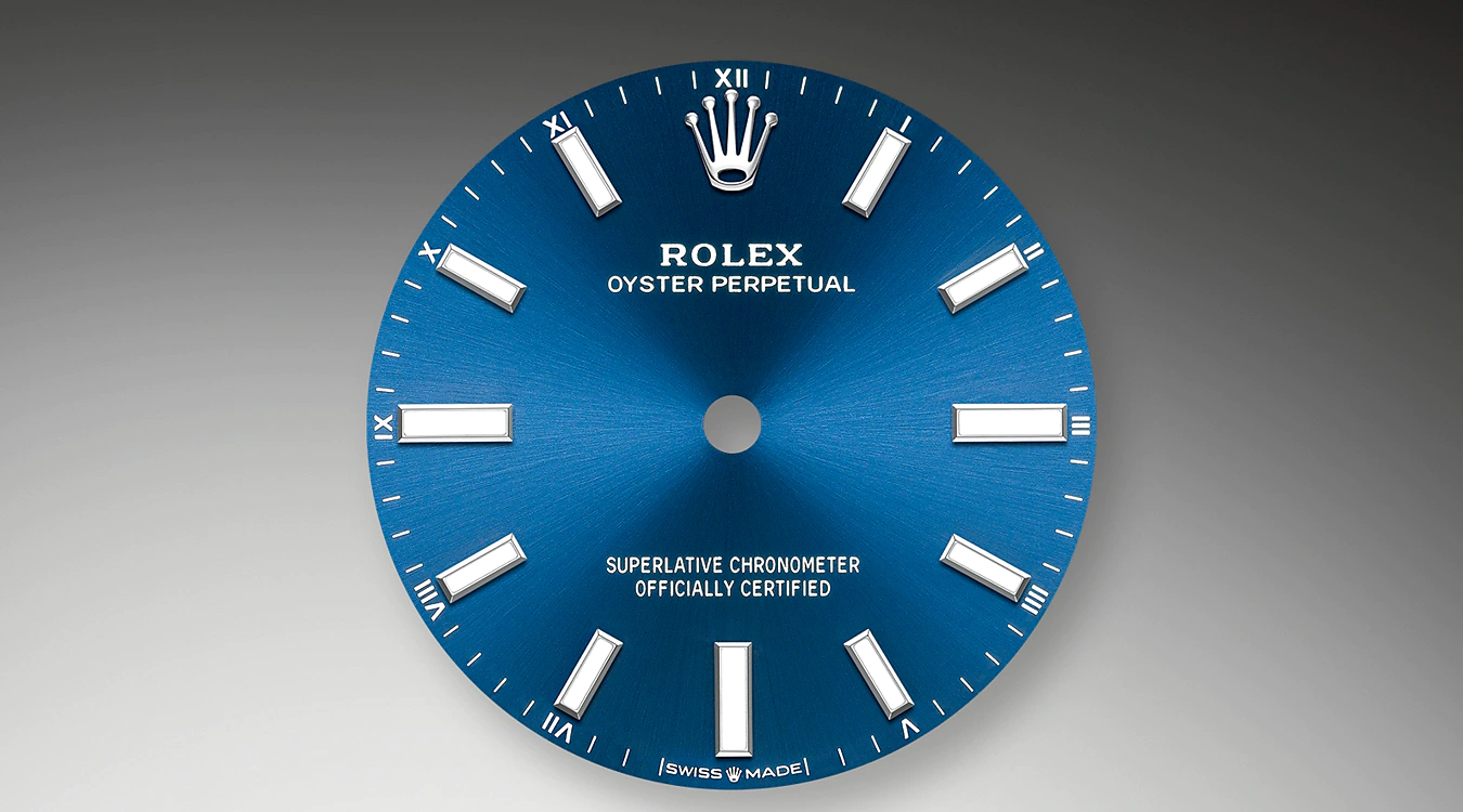 サンレイ仕上げは オイスター パーペチュアルコレクションの多くのダイアルに繊細な光の反射をもたらす。これはダイアルの中心から外側に向かって溝を作る 熟練のブラッシング技術によるものだ。光はそれぞれの彫りに沿って均一に拡散され 手首の位置に応じてわずかに動く 特徴的な輝きを生み出す。サンレイ仕上げが完了すると 物理蒸着または電気メッキによりダイアルにカラーが塗布される。軽くニスでコーティングし ダイアルの最終的な外観が完成する。