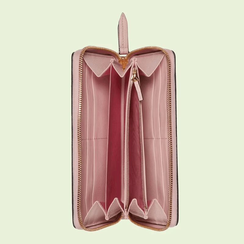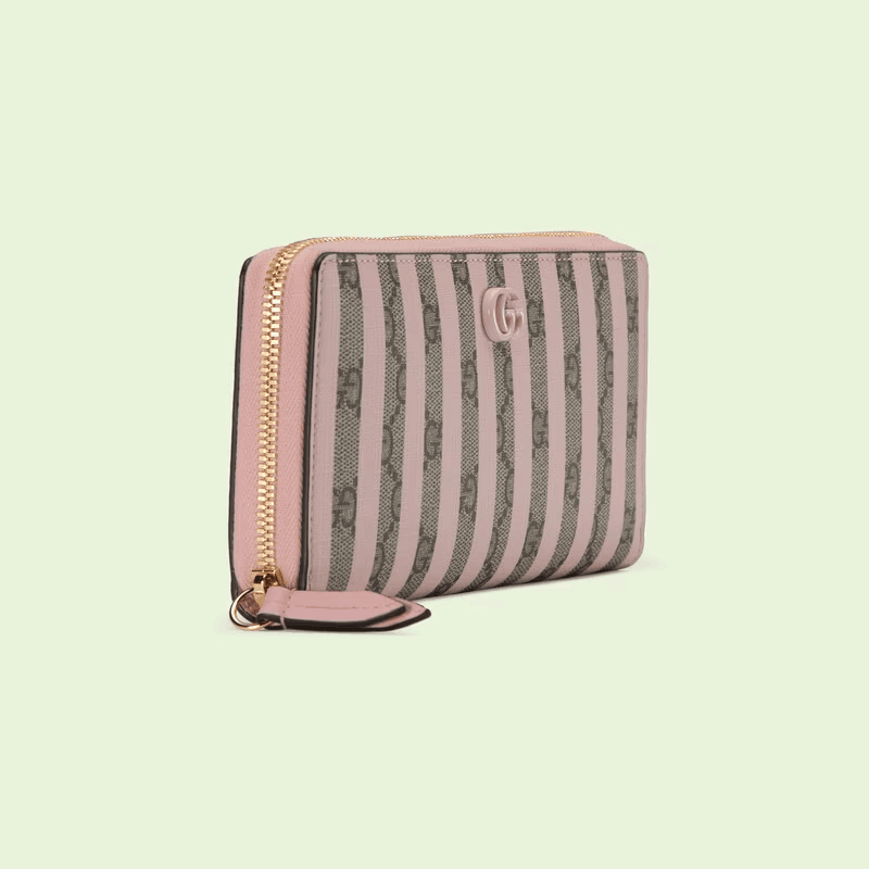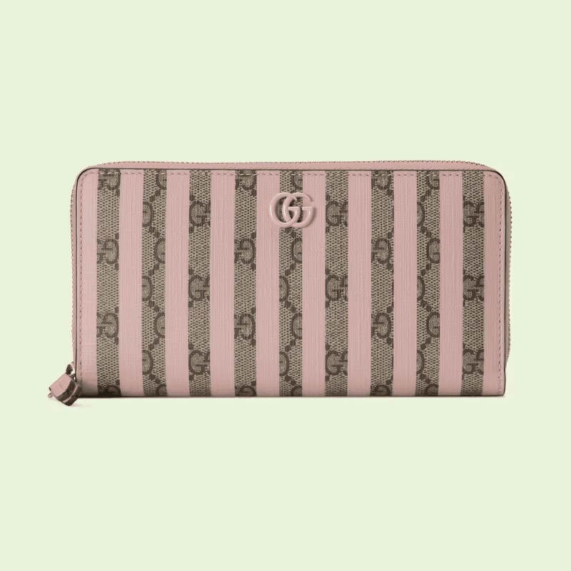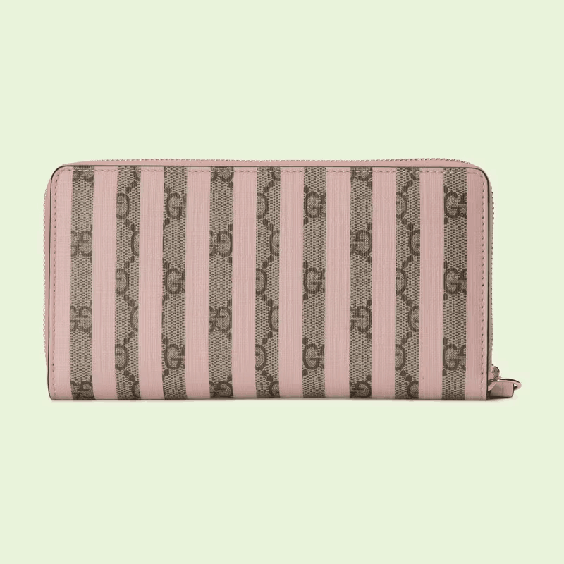 Gucci Love Paradeコレクションの随所に登場するキャンディケイン ストライプは、グッチのデザインに宿る遊び心に満ちたストーリーとのつながりを表現しています。このジップアラウンドウォレットはベージュ&エボニーのGGスプリーム キャンバスとカラフルなピンクのストライプを組み合わせて仕上げました。グッチのさまざまなエレメントを結び付けた遊び心あふれるパターンに、アーカイブから引用したダブルG ハードウェアをあしらっています。