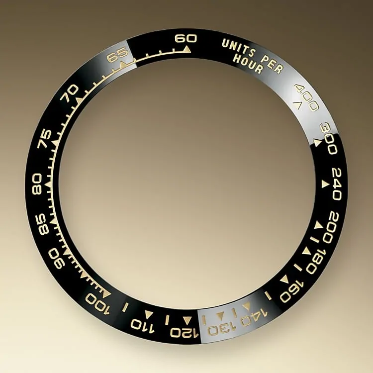 モデルの大きな特徴は、最大時速400マイルまたは時速の平均速度を測定するためのタキメーターベゼルである。ハイテクと洗練された美学を融合させたブラック ベゼルは、ブラック プレキシガラス製ベゼルインサートが取り付けられた1965年モデルを彷彿とさせる。ハイテク セラミック製の新しいモノブロック セラクロムベゼルには、耐蝕性と耐傷性に優れ、紫外線による影響を受けにくいなど多くの利点がある。また、この極めて耐久性に優れるベゼルは、PVD(物理蒸着)加工により、プラチナの薄い層でコーティングされた目盛りが並外れた視認性を提供する。モノブロック セラクロムベゼルは一体成型で、ミドルケースにしっかりとクリスタルを固定し、防水性能を保証する。