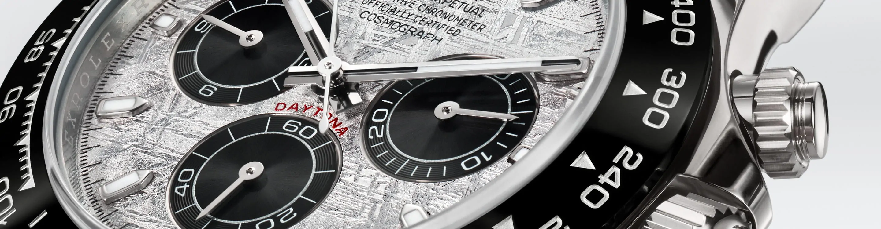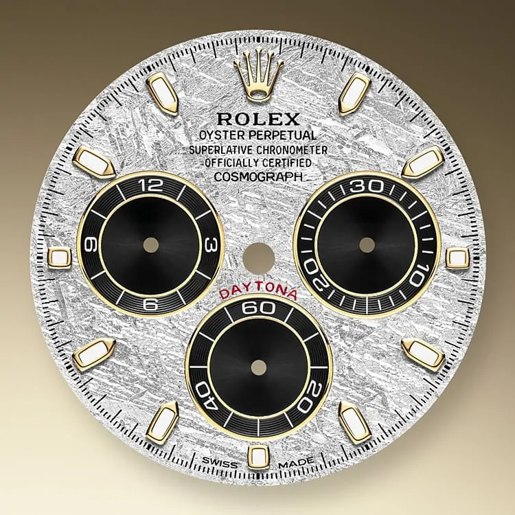 爆発した小惑星、もしくは惑星の中心部にあったメテオライトは、太陽系を飛び越えて我々の惑星の軌道に偶然取り込まれ、重力に引き寄せられて地球へと落下する。この壮大な旅の途中、溶けた小惑星の核がゆっくりと冷やされることでメテオライトの中心が徐々に変化し、極めて珍しい金属の模様を作り出す。ロレックスのデザイナーは、この素材からコスモグラフ デイトナを含むロレックスの最もプレステージの高いモデルのための特別な一品を生み出す。