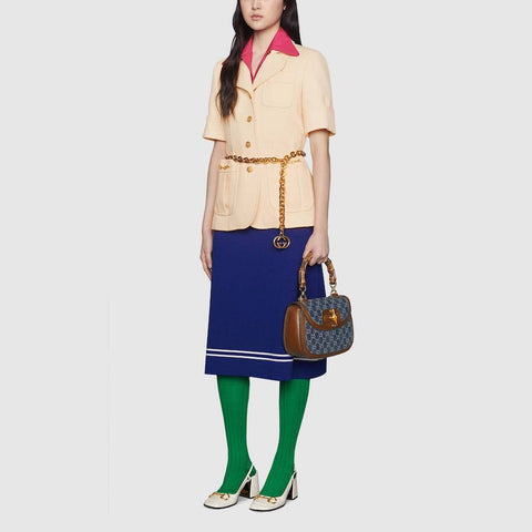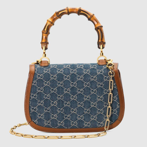 - ――【日本限定アイテム】デニムとレザーを合わせたお洒落なバック。クラシカルな形が人気のアイテムです。象徴的なバンブー ハンドルとモノグラム モチーフをあしらったこのバッグは、コレクションのテーマを反映するものであり、グッチの伝統とも深いつながりを持つアイテムです♪