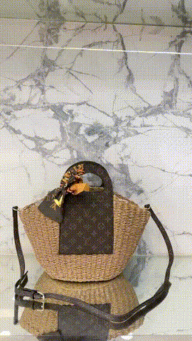 👜L&V わら織りバッグ 革と藁の組み合わせ ハンドバッグ ビーチバッグ