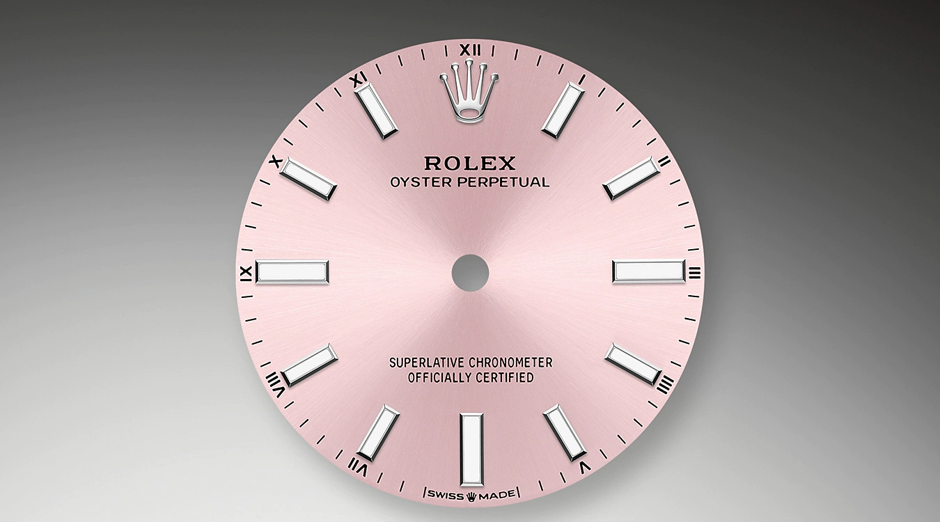 サンレイ仕上げは オイスター パーペチュアルコレクションの多くのダイアルに繊細な光の反射をもたらす。これはダイアルの中心から外側に向かって溝を作る 熟練のブラッシング技術によるものだ。光はそれぞれの彫りに沿って均一に拡散され 手首の位置に応じてわずかに動く 特徴的な輝きを生み出す。サンレイ仕上げが完了すると 物理蒸着または電気メッキによりダイアルにカラーが塗布される。軽くニスでコーティングし ダイアルの最終的な外観が完成する。