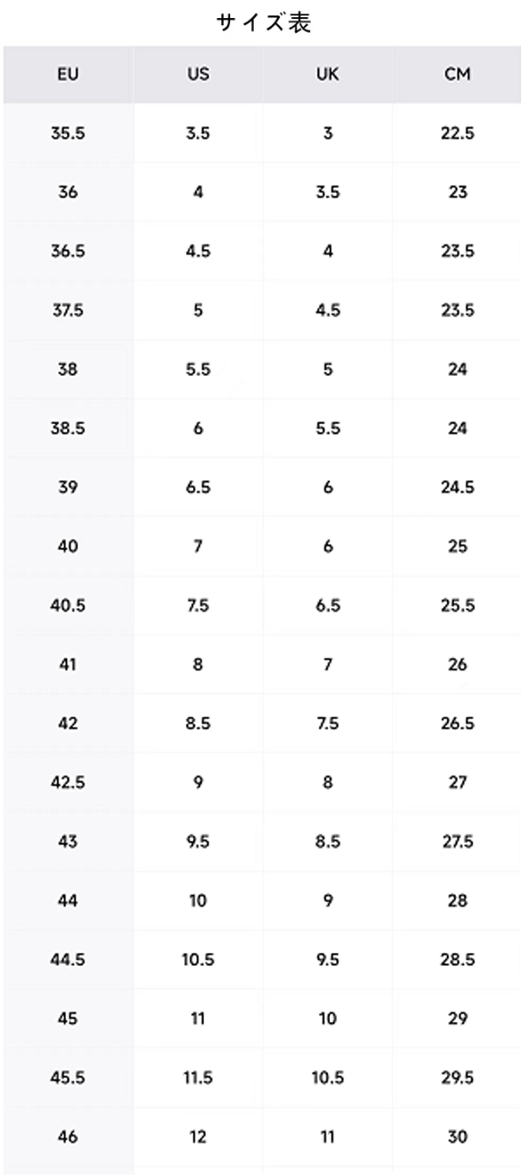 | Size | EU 36.5(23.5CM), EU 36(23CM), EU 37.5(23.5CM), EU 38.5(24CM), EU 38(24CM), EU 39(24.5CM), EU 40.5(25.5CM), EU 40(25CM), EU 41(26CM), EU 42.5(27CM), EU 42(26.5CM), EU 43(27.5CM), EU 44.5(28.5CM), EU 44(28CM), EU 45.5(29.5CM), EU 45(29CM) |